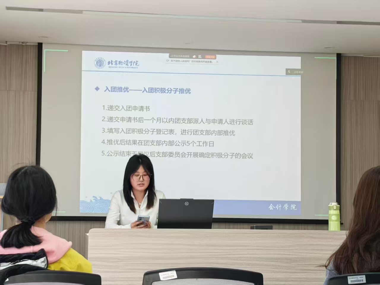 分团委组织部部长郝琪圆同学首先围绕新学期团务工作的整体规划、重点任务与日常管理制度进行了系统说明,并结合学院共青团年度工作要点,对各支部在团员教育、组织生活、主题团日、志愿服务、社会实践等方面的工作提出了明确指引与具体要求。结合当前正在开展的2026年春季学期入党、入团推优工作,郝琪圆同学详细介绍了“推优”工作的标准条件、程序步骤、材料撰写与报送规范,并结合实际工作中常见的共性问题和易错环节,通过实例分析进行了重点提示与解答。